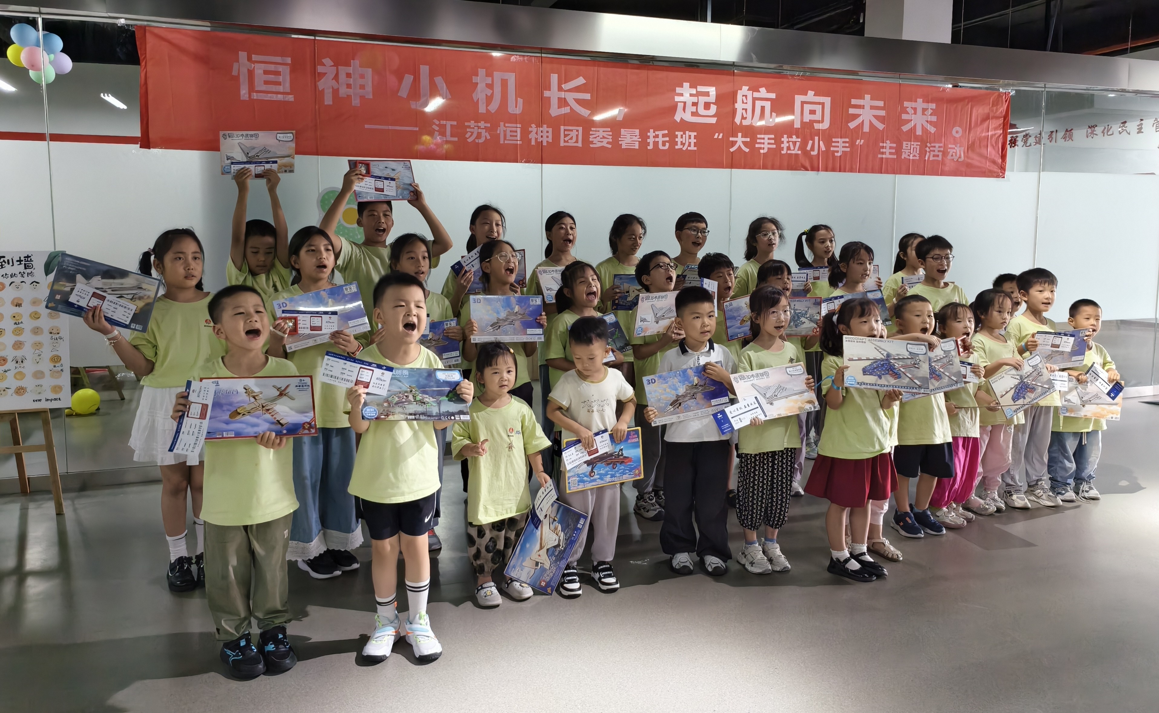8月12日下午,恒神股份愛心暑托班的活動場地變身歡樂航空港,約50名職工子女化身 “恒神小機長”,在團委青年們的帶領和陪伴下,開啟了一場充滿歡笑與成長的航空主題奇妙之旅。這場以 “恒神小機長?起航向未來” 為主題的趣味游戲活動,讓孩子們在輕松愉快的游戲中收獲了知識、初步建立了團隊互助協作的觀念。開場破冰:舞蹈牽情誼,小隊齊集結隨著歡快的音樂旋律響起,活動正式拉開帷幕。5名團委青年與孩子們手拉手圍成圈,跟著節奏蹦跳旋轉,原本有些靦腆的小朋友們很快被活潑的氛圍感染,大廳里瞬間充滿了銀鈴般的笑聲。這場破冰舞蹈就像一根無形的線,迅速拉近了青年志愿者與孩子們的距離。在簡要的自我介紹后,大家通過抽取彩色手環,分成了紅、黃、藍、綠、白五支小隊,展開了一場場趣味比拼。趣味闖關:航空主題游戲里的知識與協作折紙飛機環節迅速點燃了孩子們的激情。大家拿著 A4 紙,跟著領隊老師學習折疊技巧,有的還別出心裁地畫上笑臉和花紋。“三、二、一,起飛!” 當數十架紙飛機穿過 “書架圓環” 時,大廳里爆發出陣陣歡呼?!拔沂瞧磮D小能手” 環節堪稱對 “速度與協作” 的考驗。當飛機拼圖被分發到各隊時,孩子們立刻圍坐在一起,七手八腳地開始拼接?!斑@塊應該在這里!”“不對,看機翼的形狀!” 團委志愿者們在旁耐心引導,既不包辦代替,又及時給迷茫的小隊員們支招。最終,各支隊伍都順利完成了拼圖任務。“飛機連連看” 游戲成了記憶力大比拼。孩子們盯著倒扣的紙牌,時而蹙眉思考,時而拍手歡呼,團委志愿者們則在一旁計時鼓勁、還要熱心的小朋友不時用掌聲鼓勵加油。最終,所有孩子都贏得了木制飛機模型拼圖,獲勝隊伍的小朋友還優先挑選了心儀的款式。溫情收尾:徽章與機票見證成長,愛與理念扎根心間活動尾聲,每位小飛行員都領到了閃亮的 “恒神小機長” 徽章,驕傲地別在胸前。當印有每個孩子名字的 “結業機票” 被鄭重頒發時,不少小朋友舉著機票和模型向志愿者們開心地道謝。本次活動旨在讓職工子女在歡樂中感受航空精神,同時通過青年志愿者的陪伴,傳遞企業對員工家庭的關懷。這場持續兩小時的活動,像一根堅韌的 “情感碳纖維”,將企業、家庭與孩子緊緊相連。恒神團委的青年們用熱情與愛心,為孩子們的暑假添上了一抹明亮的色彩,也讓 “愛與未來一起飛” 的溫暖理念,深深扎根在每個人心中。